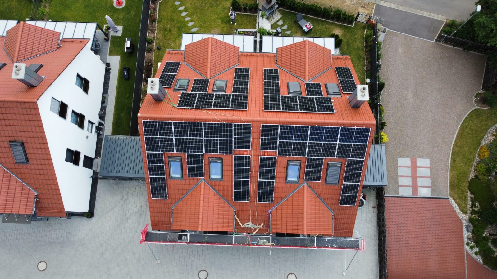 Für ein aktuelles Projekt haben wir pro Doppelhaushälfte eine 8 kWp Photovoltaikanlage installiert – ausgestattet mit einem Huawei Wechselrichter und einem leistungsstarken Batteriespeicher.